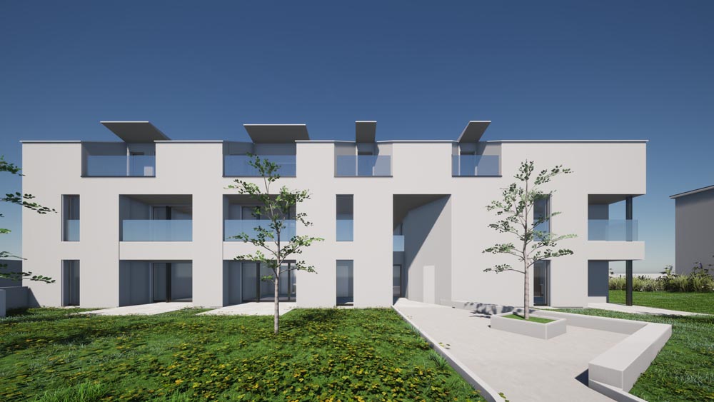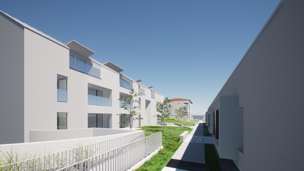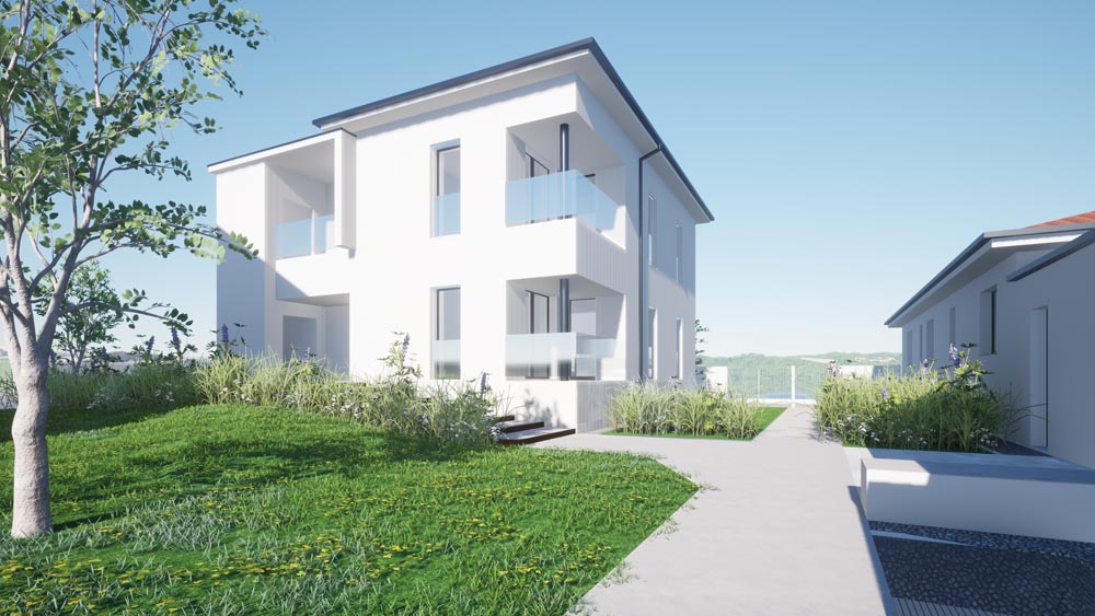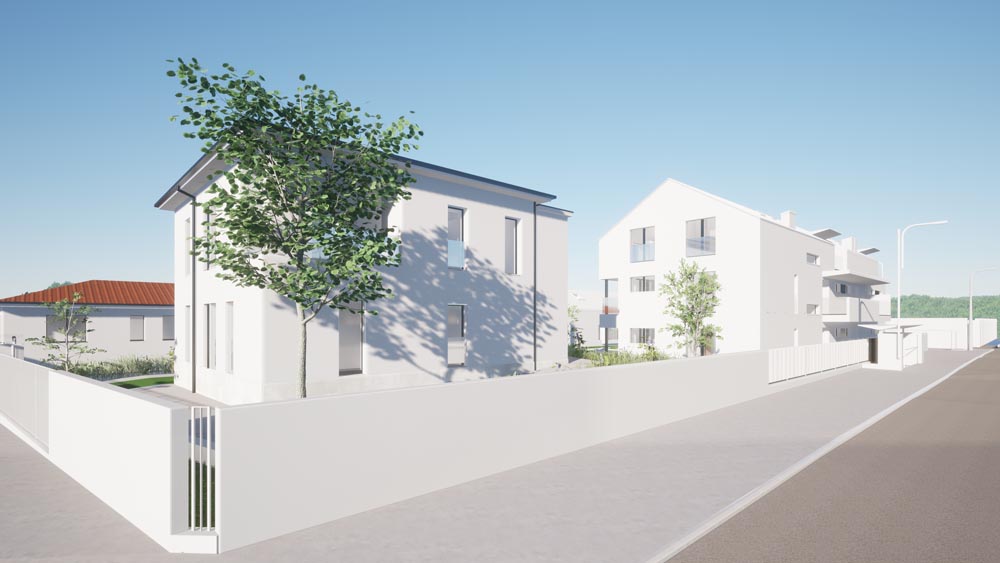 L’intervento prevede la ricostruzione, sul sedime dell’edificio industriale, di due corpi paralleli orientati all’incirca sull’asse est-ovest: in maniera corretta, quindi, dal punto di vista bioclimatico. Gli edifici in progetto saranno caratterizzati da un impianto volumetrico semplice e da una copertura a doppia falda disposta secondo la direzione prevalente. Le masse, stereometriche, profondamente incise dalle logge e dai profili netti delle aperture, saranno intonacate in tinta chiara, mentre il manto di copertura e le lattonerie saranno realizzati in lamina di zinco-titanio di colore grigio ardesia. I pluviali saranno in alluminio naturale, mentre gli altri particolari metallici, come i parapetti e le ringhiere o la finitura esterna in alluminio dei serramenti, i davanzali e le lamelle degli oscuranti saranno in tinta grigio grafite, a contrastare il chiaro dell’intonaco. Gli stessi materiali saranno utilizzati nella ristrutturazione della villa, a conferire unità all’intervento.