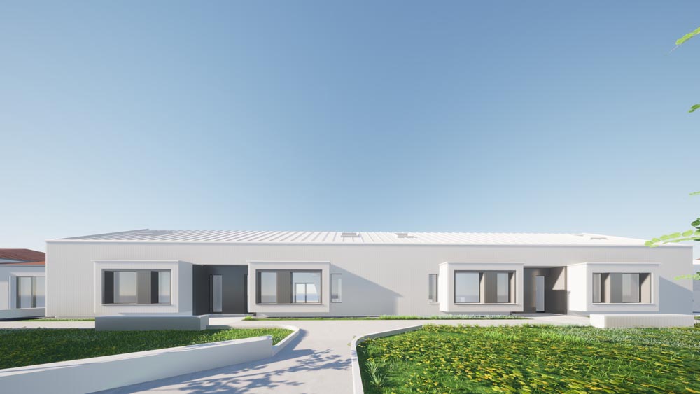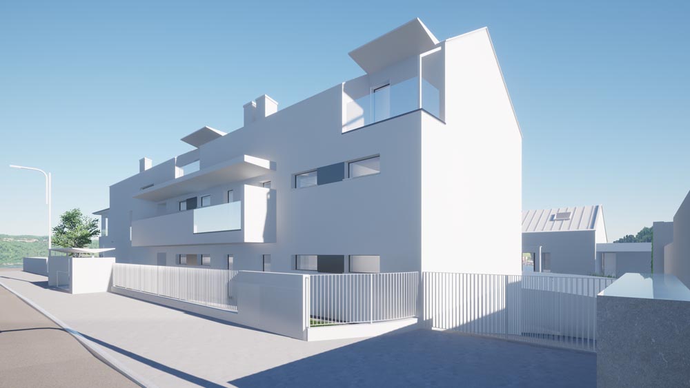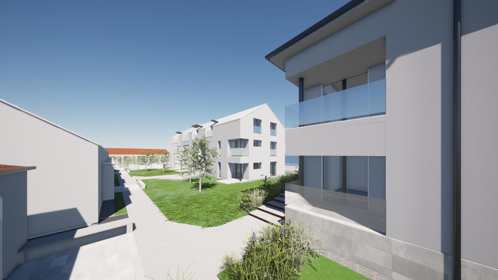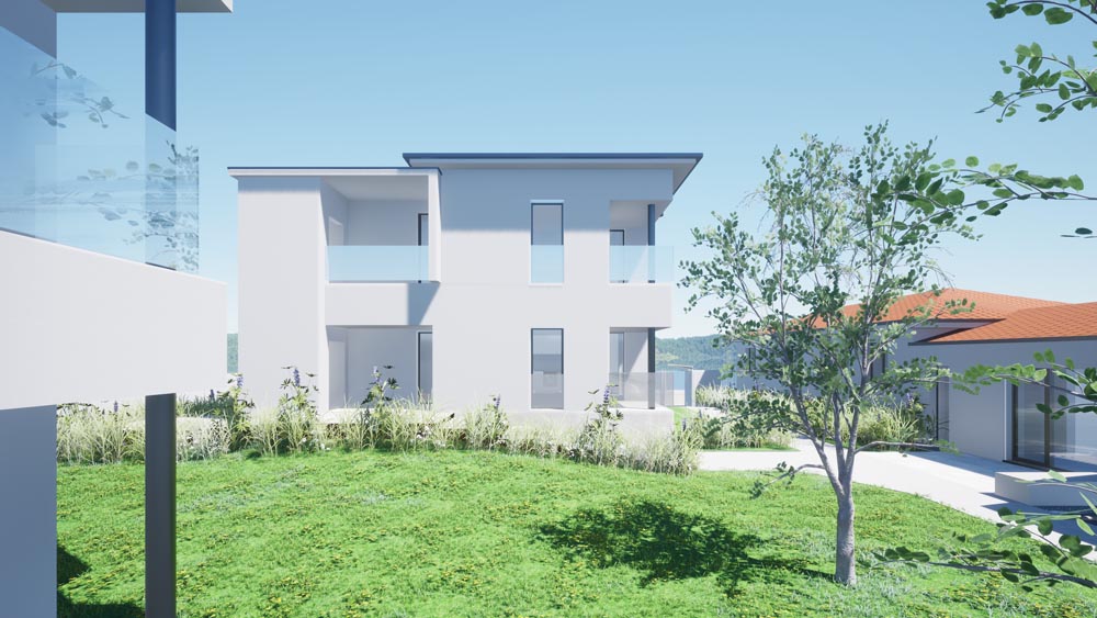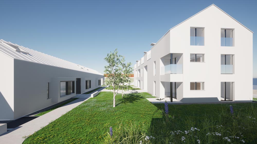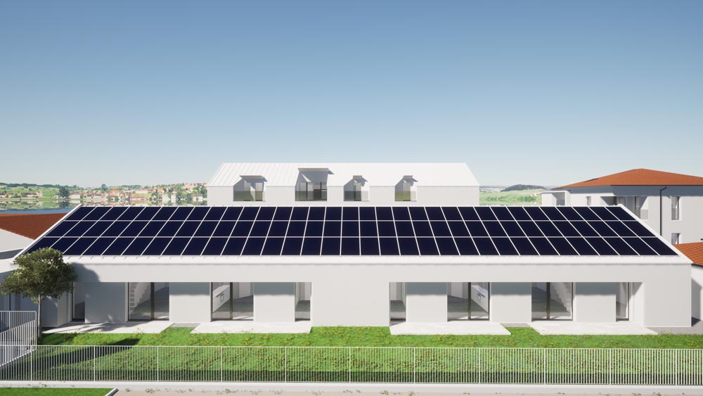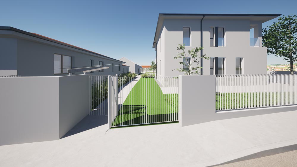L’intervento prevede la ricostruzione, sul sedime dell’edificio industriale, di due corpi paralleli orientati all’incirca sull’asse est-ovest: in maniera corretta, quindi, dal punto di vista bioclimatico. Gli edifici in progetto saranno caratterizzati da un impianto volumetrico semplice e da una copertura a doppia falda disposta secondo la direzione prevalente. Le masse, stereometriche, profondamente incise dalle logge e dai profili netti delle aperture, saranno intonacate in tinta chiara, mentre il manto di copertura e le lattonerie saranno realizzati in lamina di zinco-titanio di colore grigio ardesia. I pluviali saranno in alluminio naturale, mentre gli altri particolari metallici, come i parapetti e le ringhiere o la finitura esterna in alluminio dei serramenti, i davanzali e le lamelle degli oscuranti saranno in tinta grigio grafite, a contrastare il chiaro dell’intonaco. Gli stessi materiali saranno utilizzati nella ristrutturazione della villa, a conferire unità all’intervento.